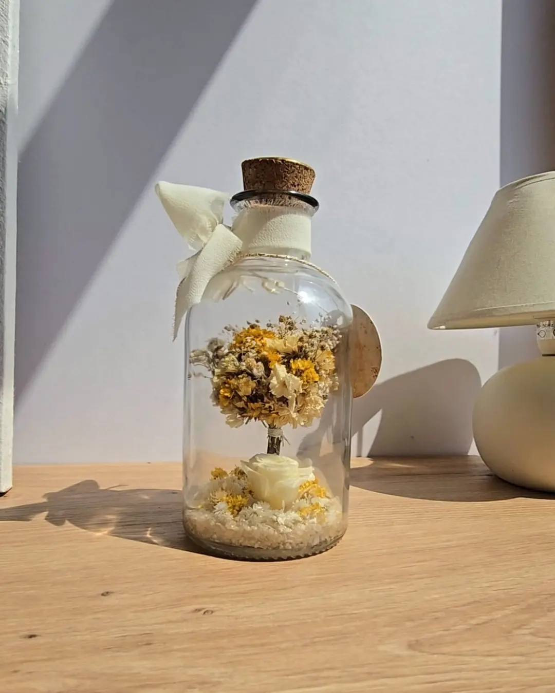 Las flores principales están fijadas para que no se muevan ni se dañen durante el envío. Solo algunos pequeños detalles decorativos de la base van sueltos como parte del diseño. Si durante el transporte se desplazan un poco, basta con agitar suavemente la botella para que vuelvan a colocarse.